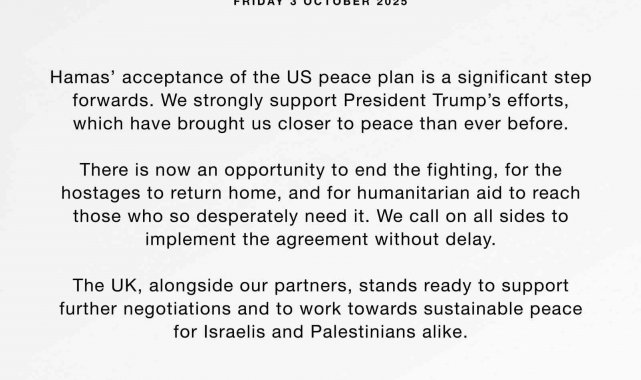 İngiltere Başbakanı Keir Starmer, Hamas'ın Gazze'de ateşkes planına verdiği yanıtın ardından yazılı açıklama yaptı. Başbakan Starmer açıklamasında, "Hamas'ın ABD'nin barış planını kabul etmesi önemli bir adım. Başkan Trump'ın bizi barışa her zamankinden daha fazla yaklaştıran çabalarını güçlü bir şekilde destekliyoruz. Artık çatışmaların sona ermesi, rehinelerin evlerine dönmesi ve insani yardımın acilen ihtiyaç duyanlara ulaşması için bir fırsat var. Tüm tarafları anlaşmayı gecikmeden uygulamaya çağırıyoruz. İngiltere, ortaklarıyla birlikte daha fazla müzakereyi desteklemeye ve hem İsrailliler hem de Filistinliler için sürdürülebilir bir barışa doğru çalışmaya hazır" ifadelerini kullandı.