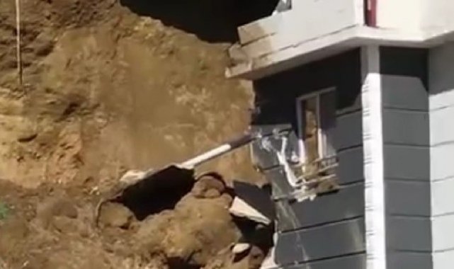 Denizli'nin Merkezefendi ilçesinde devam eden 4 katlı inşaat alanından kopan kaya parçası, kot farkı bulunan bitişikteki 3 katlı binanın üzerine düştü. İstinat duvarının bulunmadığı olayda şans eseri yaralanan olmazken, bina ağır hasar aldı.