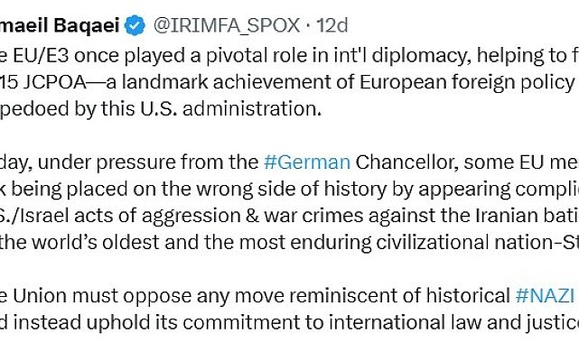 İran Dışişleri Bakanlığı Sözcüsü İsmail Bekayi, sosyal medya üzerinden Avrupa Birliği (AB) ile Almanya, Fransa ve İngiltere'den oluşan E3 ülkelerine yönelik eleştirilerde bulundu. AB ve E3'ün bir zamanlar uluslararası diplomaside çok önemli bir rol oynadığını ve Avrupa dış politikasının dönüm noktası niteliğindeki 2015 Ortak Kapsamlı Eylem Planı'nın (İran Nükleer Anlaşması) şekillenmesine yardımcı olduğunu hatırlatan Bekayi, "Ancak bu anlaşma ABD yönetimi tarafından baltalandı" hatırlatmasında bulundu. Bu ülkelerin bugün ise ABD ve İsrail'in İran'a yönelik saldırılarına ortak olma eğiliminde olduğunu kaydeden Bekayi, "Bazı AB üyeleri, Almanya Şansölyesinin baskısı altında dünyanın en eski ve en köklü medeniyetlerinden biri olan İran'a yönelik ABD ile İsrail saldırganlıklarına ve savaş suçlarına ortak gibi görünmektedir. Bu devletler tarihin yanlış tarafında yer alma riskiyle karşı karşıyadır" ifadelerini kullandı. AB'yi ABD ve İsrail'e verdiği destek nedeniyle eleştiren Bekayi, "Birlik, tarihsel Nazi zihniyetlerini hatırlatan her türlü harekete karşı çıkmalı ve bunun yerine uluslararası hukuka ve adalete olan bağlılığını sürdürmelidir" çağrısı yaptı.