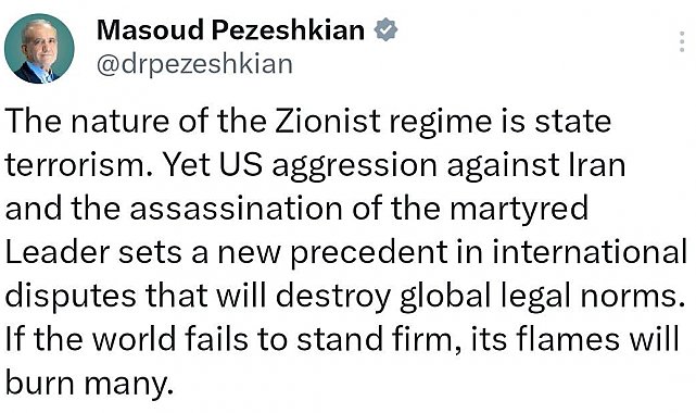 İran Cumhurbaşkanı Mesud Pezeşkiyan, sosyal medya hesabından ABD ve İsrail'in ülkesine yönelik saldırıları ile ilgili açıklamalarda bulundu. Devlet terörizminin İsrail'deki siyonist rejimin doğası olduğunu vurgulayan Pezeşkiyan, "Ancak, ABD'nin İran'a karşı saldırganlığı ve şehit liderimize yönelik suikast uluslararası hukuk normlarını yıkan yeni bir emsal teşkil etmektedir. Eğer dünya bu duruma kararlı şekilde karşı çıkmazsa, alevleri birçoğunu yakacaktır" ifadelerini kullandı.