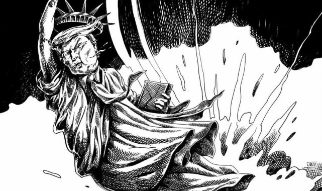 Hamaney'in paylaşımına dikkat çeken bir karikatür de ekledi. Görselde, ABD'deki Özgürlük Heykeli ABD Başkanı Donald Trump'ın yüzüyle tasvir edilirken, İran tarafından yüzüne tokat indirildiği an resmedildi. Saldırı anı, güçlü bir ışık ve patlama efektiyle yansıtılırken, heykelin elindeki meşalenin düşmek üzere olması dikkat çekti.