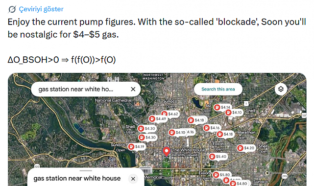 ABD'nin İran limanlarına giriş ve çıkışları kapsayan deniz trafiğine yönelik abluka kararına İran cephesinden tepki geldi. İran Meclis Başkanı Muhammed Bakır Galibaf, sosyal medya hesabından yaptığı paylaşımda, ABD'nin kararının benzin fiyatlarında daha fazla artışa yol açacağına dikkat çekerek, "Şu an pompaya yansıyan benzin fiyatlarının tadını çıkarın. Sözde 'abluka' ile birlikte, yakında 4-5 dolarlık benzini özleyeceksiniz" dedi. Galibaf, farklı benzin istasyonlarındaki fiyatları gösteren bir uygulamada yaptığı "Beyaz Saray'a yakın benzin istasyonu" aramasının ekran görüntüsünü paylaştı.