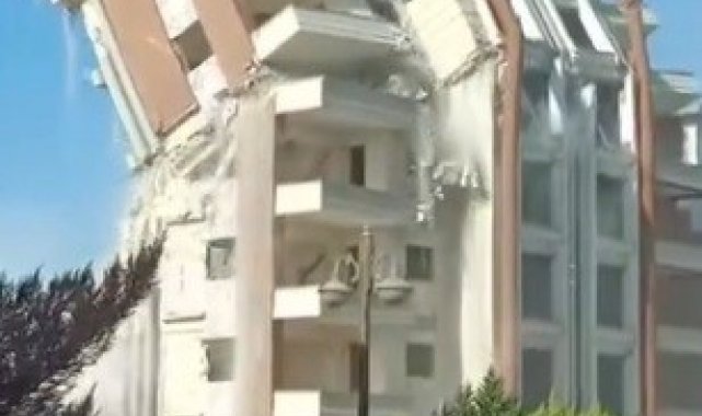 Hatay'ın Kırıkhan ilçesinde, 9 katlı binanın iş makinesinin dokunuşuyla kontrollü olarak yıkıldığı anlar kameraya yansıdı.