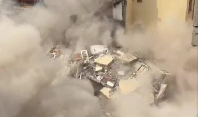 İş makinesinin dokunuşuyla 4 katlı bina yerle bir oldu