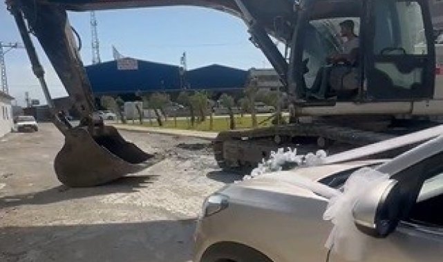 İş makinesiyle gelin arabasının önünü kesen operatör, bahşiş alınca yolu açtı