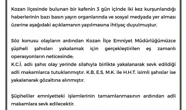 Valilikten yapılan açıklamada şu ifadelere yer verildi: "Olayın ardından Kozan İlçe Emniyet Müdürlüğü ekipleri eş zamanlı operasyon düzenledi. Operasyon kapsamında K.C.İ. isimli şüpheli olay yerinde silahla birlikte yakalanarak adli makamlara sevk edildi ve tutuklandı. Ayrıca K.B., E.S., M.K. ve H.H.T. isimli şüpheliler de gözaltına alındı. Şüpheliler emniyetteki işlemlerinin ardından adliyeye sevk edilecek."