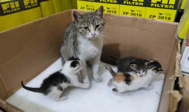 İş yerinde doğum yapan anne kedi ve yavrularına gözü gibi bakıyor