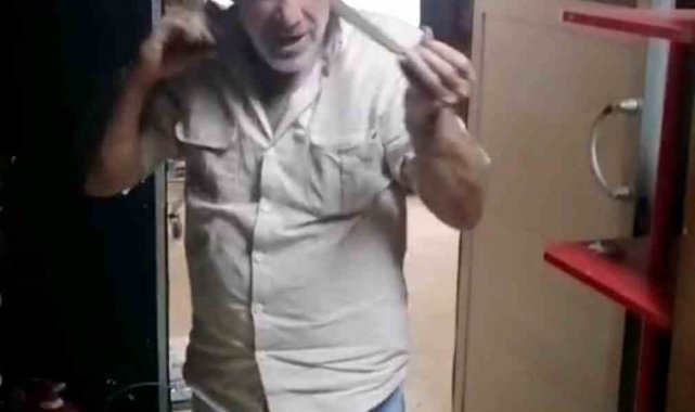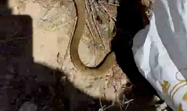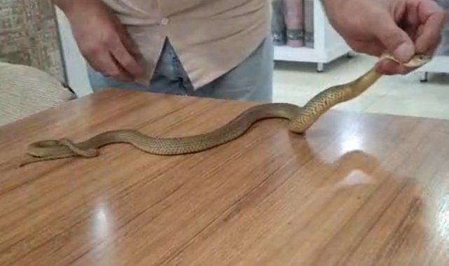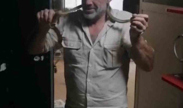 İş yerine giren 2 metrelik yılana "kanka" diye hitap edip boynuna doladı