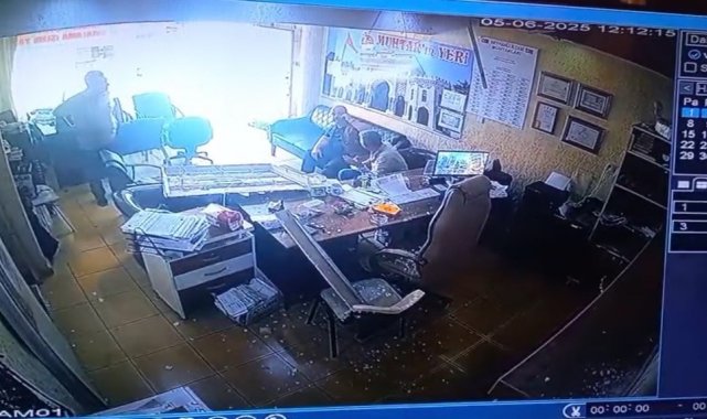 Hatay'ın Reyhanlı ilçesinde bir ofiste bulunan avizenin monte edildiği asma tavanın çökmesiyle yaşanan panik kameraya yansıdı.