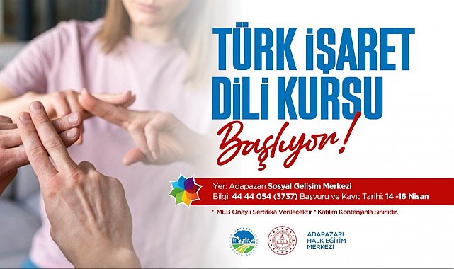 Sakarya Büyükşehir Belediyesi Sosyal Gelişim Merkezi'nde toplumda iletişim engellerini kaldırmak ve farkındalık oluşturmak amacıyla "Türk İşaret Dili Kursu" düzenliyor. Bakanlık onaylı sertifikanın verileceği kursa başvurular 14-16 Nisan tarihlerinde alınacak.