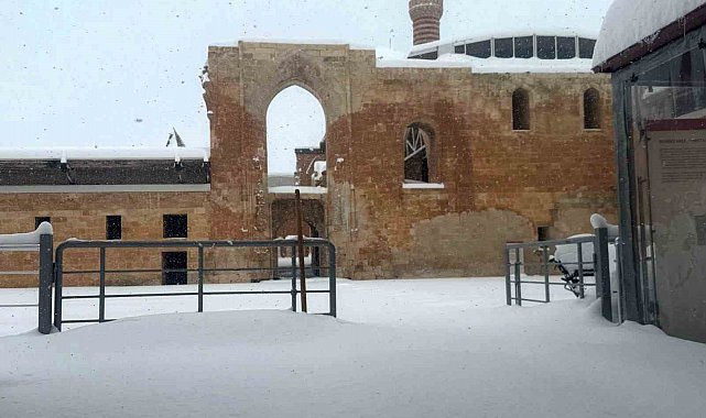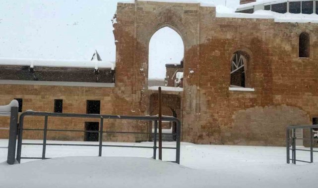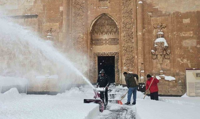 Her yıl binlerce yerli ve yabancı turisti ağırlayan İshak Paşa Sarayı'nda, kış aylarında da ziyaretçilerin güvenli bir ortamda gezebilmesi için düzenli olarak kar temizleme çalışmaları yapılıyor.