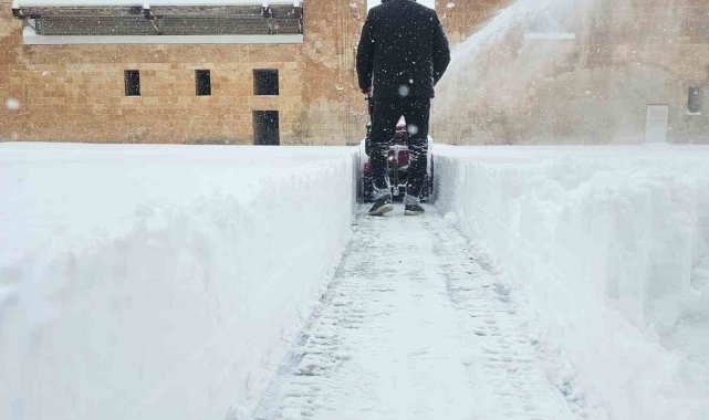 Ekipler, kar püskürtme makinesiyle avlu ve yürüyüş yollarını temizlerken, işçiler de kürek yardımıyla biriken karları kaldırarak çalışmalarını sürdürüyor.