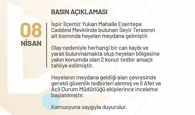 Erzurum Valiliği'nden alınan bilgilere göre olay, İspir ilçesi Yukarı Mahalle Esentepe Caddesi mevkiinde bulunan seyir terasının alt kısmında meydana geldi. Heyelan sonrası bölgeye ekipler sevk edildi. Yaşanan doğa olayında herhangi bir can kaybı veya yaralanmanın bulunmadığı belirtilen açıklamada, heyelan bölgesine yakın konumda bulunan 2 konutun güvenlik gerekçesiyle tahliye edildiği kaydedildi.