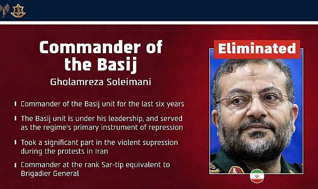 İsrail ordusu, İran Devrim Muhafızları Ordusu Besic Güçleri Komutanı Gulam Reza Süleymani'nin dün Tahran'a düzenlenen saldırıda öldürüldüğünü iddia etti.