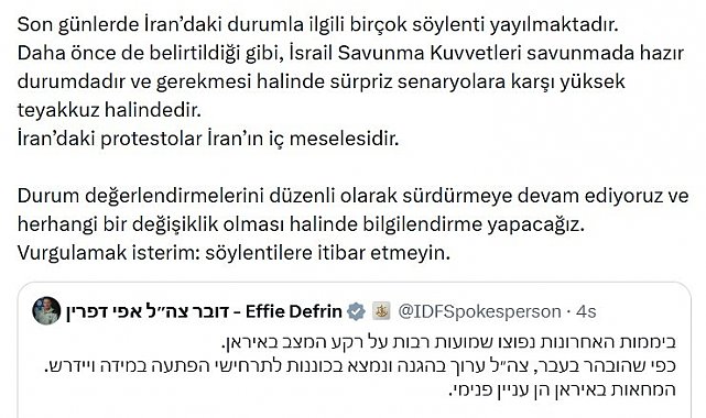 İsrail ordusunun İran'daki gelişmelerle ilgili düzenli değerlendirmeler yapmayı sürdürdüğü vurgulanan açıklamada, "Pozisyonumuzda herhangi bir değişiklik olması halinde bilgilendirme yapacağız. Vurgulamak isterim: Söylentilere itibar etmeyin" denildi.