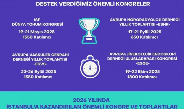 Avdagiç, "Turizm Geliştirme ve Eğitim Vakfı (TUGEV) ve ICVB olarak küresel turizm ve kongre sektörlerinde İstanbul'u temsil ediyoruz. Geçtiğimiz yıla kıyasla 14 adet artan kongre sayımızın 2025 ve 2026 yıllarında daha da artması için çalışmalarımız sürüyor. Aynı şekilde, 2025 yılında şehrimize kazandırdığımız ve bizim destek verdiğimiz 15 uluslararası kongreye ve 2026 yılında ise aralarında Uluslararası Kulak Burun Boğaz Dernekleri Federasyonu'nun 8 bin 500 katılımcılı uluslararası kongresinin de yer aldığı 3 kongreye ev sahipliği yapacağız. 2025 yılı ve sonrasında da İstanbul'a alınması için ICVB olarak adaylık çalışması yaptığımız ve katılımcı sayıları 500 ile 5.000 arasında değişen 7 uluslararası kongre mevcut" bilgisini verdi.