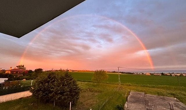 İstanbul Silivri'de yağışın ardından ortaya çıkan gökkuşağı günbatımı ile birleşince görsel şölenr sundu.