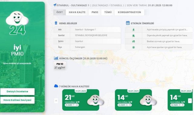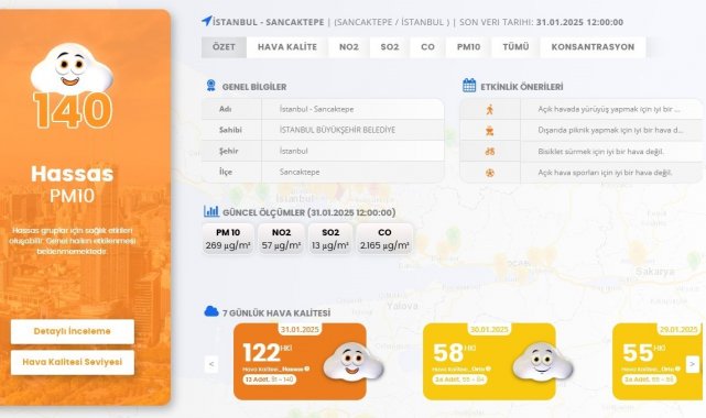 Çevre, Şehircilik ve İklim Değişikliği Bakanlığı Hava Kalite Ölçüm istasyonlarından derlenen verilere göre, Sancaktepe'de bugün saat 12.00 itibarıyla ortalama partikül madde (PM10) hava kirliliği konsantrasyonu 269 g/m3 (mikrogram bölü metreküp) ölçüldü. Burayı sırasıyla 228 g/m3 ile Göztepe, 117 g/m3 ile Esenyurt istasyonları takip etti. Bugün için hava kirliliğinin en az ölçüldüğü istasyon 27 g/m3 ile Sultangazi olurken, partikül madde hava kirliliği Beylikdüzü istasyonunda 35 g/m3 olarak belirlendi.