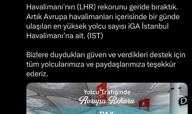 İstanbul Havalimanı'nın ulaştığı bu başarı, İGA'nın sosyal medya hesabından paylaşıldı. X platformundan yapılan paylaşımda, "25 Temmuz 2025 tarihinde, bir günde toplam 271 bin 836 yolcuya hizmet vererek Avrupa'nın günlük yolcu rekorunu kırdık! Bu başarıyla birlikte, daha önce 30 Haziran 2024 tarihinde 268 bin yolcuyla bu alandaki liderliği elinde bulunduran Londra Heathrow Havalimanı'nın (LHR) rekorunu geride bıraktık. Artık Avrupa havalimanları içerisinde bir günde ulaşılan en yüksek yolcu sayısı iGA İstanbul Havalimanı'na ait. (IST) Bizlere duydukları güven ve verdikleri destek için tüm yolcularımıza ve paydaşlarımıza teşekkür ederiz" ifadelerine yer verildi.