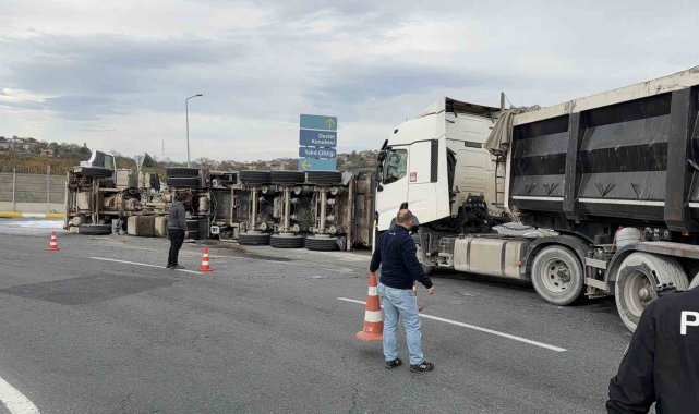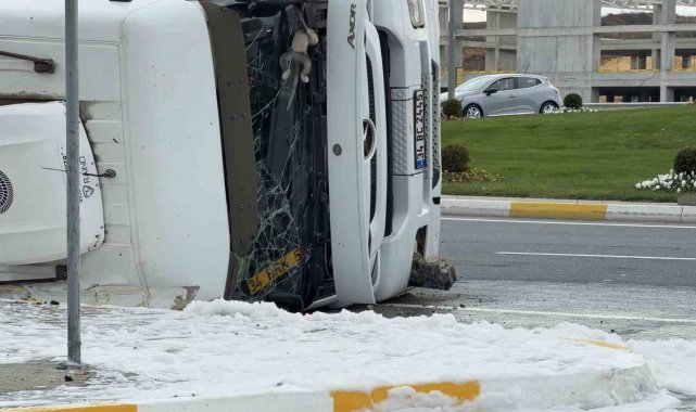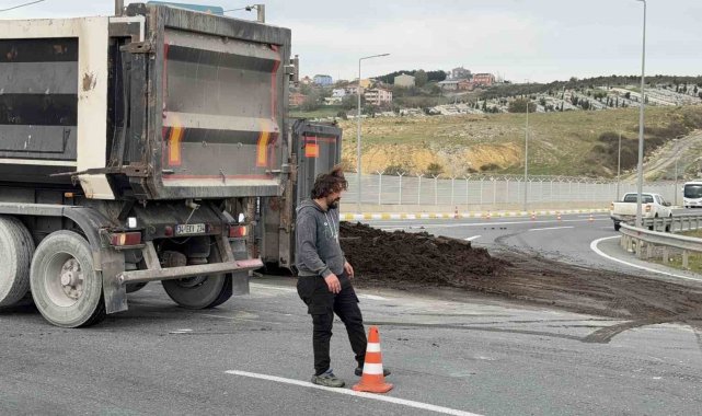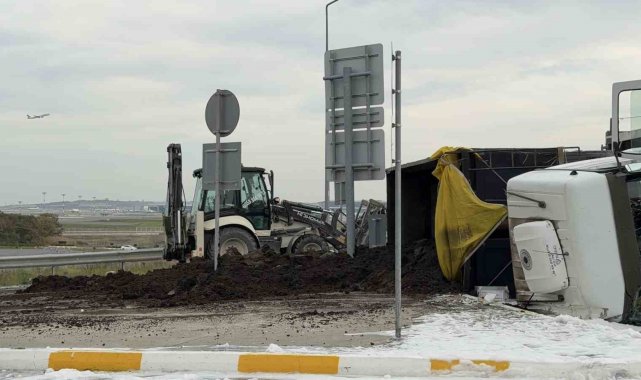 İstanbul Havalimanı yolunda gübre yüklü bir hafriyat kamyonu, bağlantı kavşağına girdiği sırada kontrolden çıkarak yan yattı. Kazada kamyon şoförü yaralanırken, tonlarca gübre yola döküldü.