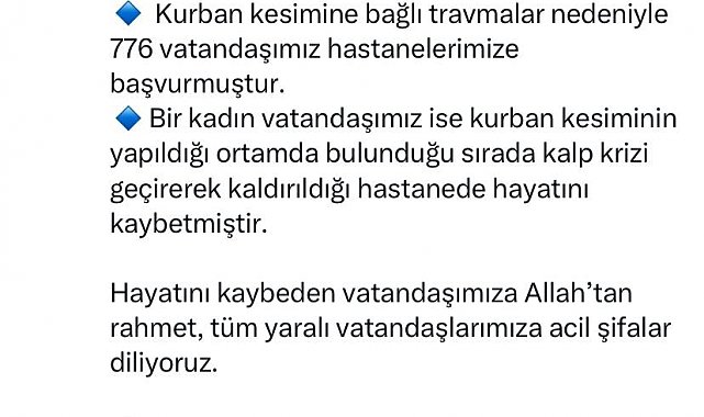 İstanbul İl Sağlık Müdürü Doç. Dr. Abdullah Emre Güner, sosyal medya hesabından yaptığı açıklamada, "Bugün İstanbul'da trafik kazaları nedeniyle 53 vatandaşımız, kurban kesimine bağlı travmalar nedeniyle 776 vatandaşımız hastanelerimize başvurmuştur. Bir kadın vatandaşımız ise kurban kesiminin yapıldığı ortamda bulunduğu sırada kalp krizi geçirerek kaldırıldığı hastanede hayatını kaybetmiştir. Hayatını kaybeden vatandaşımıza Allah'tan rahmet, tüm yaralı vatandaşlarımıza acil şifalar diliyoruz. Kurban kesiminin ehil kişilerce, uygun ve güvenli ortamlarda yapılması hayati önemdedir. Lütfen hem kendi sağlığınızı hem çevrenizdekilerin güvenliğini riske atmayın" ifadelerini kullandı.