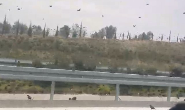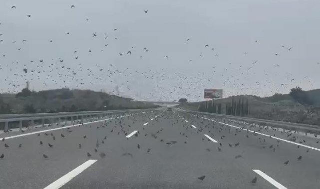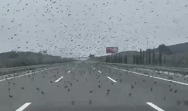 Yüzlerce sığırcık soğuk hava sebebiyle Bursa-İzmir otobanı üzerine kondu. Sığırcıklara çarpmamak için neredeyse durma noktasına gelen sürücüler o anları cep telefonlarıyla görüntülediler.