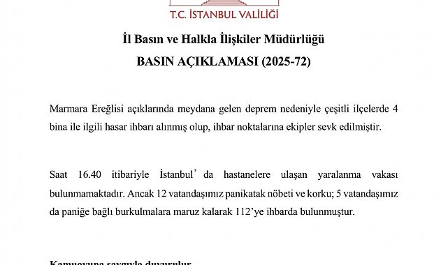 Marmara'da saat 14.55'te 5 büyüklüğünde deprem sonrası İstanbul Valiliği'nden yapılan açıklamada, "4 bina ile ilgili hasar ihbarı alınmış olup, ihbar noktalarına ekipler sevk edilmiştir. Saat 16.40 itibariyle İstanbul'da hastanelere ulaşan yaralanma vakası bulunmamaktadır. Ancak 12 vatandaşımız panikatak nöbeti ve korku; 5 vatandaşımız da paniğe bağlı burkulmalara maruz kalarak 112'ye ihbarda bulunmuştur" denildi.