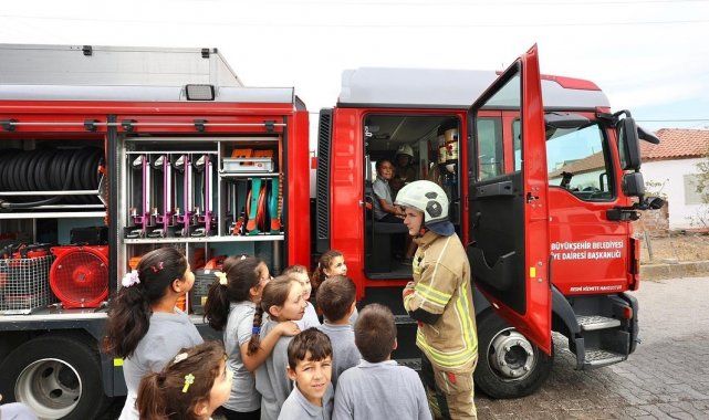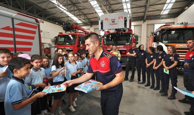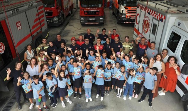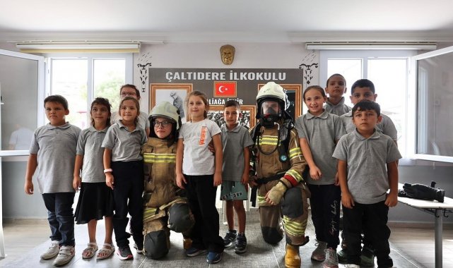 İzmir'in Aliağa ilçesinde Çaltıdere İlkokulu'nu ziyaret eden İtfaiye Grup Amirliği ekipleri, itfaiyeciliğe ilgi duyan miniklere, yangın söndürme araçlarını tanıtılarak yangın güvenliği konusunda bilgiler verdi.