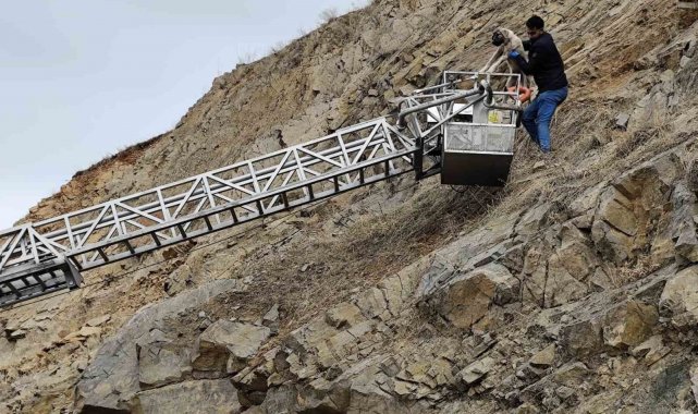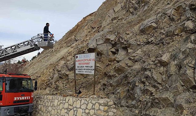 Pertek'te kayalıklarda bir köpeğin mahsur kaldığı ihbarını alan itfaiye ekipleri olay yerine giderek köpeği mahsur kaldığı yerden kurtarabilmek için çalışma başlattı. Ekipler, yaklaşık 20 metre yükseklikte bulunan köpeğe ulaşmak için kayalıkların üzerine itfaiye asansörü çekti. Saatler süren çalışmanın ardından ekipler, asansörle köpeği bulunduğu yerden kurtarıp doğal yaşam ortamına bıraktı.