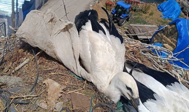 Vatandaşlardan gelen ihbar üzerine sepetli araçla leylek yuvasına ulaşan itfaiye personeli uzun bir uğraştan sonra boynuna poşet dolanan leyleği kurtardı.