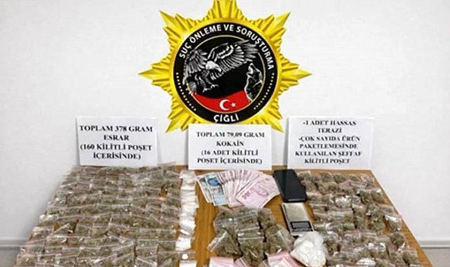 Çiğli İlçe Emniyet Müdürlüğü Suç Önleme ve Soruşturma Büro Amirliği ekipleri, Cumhuriyet ve Demokrasi Parkı içerisinde uyuşturucu ticareti yapıldığı ihbarı üzerine bölgeyi teknik ve fiziki takibe aldı. Saha çalışmaları kapsamında park içerisinde şüpheli hareketler sergileyen 16 yaşındaki E.A. isimli şahıs durduruldu. Henüz çocuk yaşta olmasına rağmen adeta bir uyuşturucu deposu gibi hareket eden E.A.'nın üzerinden çıkanlar polis ekiplerini bile hayrete düşürdü. Yapılan aramalarda; 160 ayrı kilitli poşet içerisinde toplam 378 gram esrar, 16 ayrı kilitli poşet içerisinde 79.9 gram kokain, uyuşturucu tartımında kullanılan 1 adet hassas terazi ile hazırlık için stoklanmış çok sayıda boş kilitli poşet ele geçirildi.