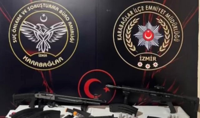 Karabağlar İlçe Emniyet Müdürlüğü Suç Önleme ve Soruşturma Büro Amirliği ekipleri, ateşli silahla yaralama olayıyla ilgili bir eve operasyon düzenledi. Yaralı şahsın kendi imkanlarıyla hastaneye gittiği, tutarsız bilgiler verip tedaviyi reddederek ayrıldığı belirlendi. Ekipler, arama kararıyla olayın yaşandığı eve girdi. İkamette şahsın babası A.B. ve eniştesi Ö.G. bulunurken, yaralı şüphelinin evde olmadığı tespit edildi. Evde yapılan aramalarda 1 adet uzi hafif makineli tüfek, 1 adet ruhsatsız tabanca, 2 adet pompalı tüfek, 6 adet tüfek şarjörü ve 1 adet tabanca şarjörü bulundu. Aramalarda ayrıca 139 adet uyuşturucu hap, 30 gram esrar ve 63 bin TL ele geçirildi. Şüphelinin ikamet önündeki aracında yapılan aramada ise 69 adet fişek ve 1 adet rambo bıçağı bulundu. İkamet içerisinde yapılan incelemelerde şüphelinin kendisini yaraladığı belirlendi. Şüpheli M.A.B., tedavi amacıyla gittiği başka bir hastanede polis ekiplerince yakalandı. Gözaltına alınan M.A.B., A.B. ve Ö.G.'nin emniyetteki işlemlerinin ardından adliyeye sevk edileceği öğrenildi.