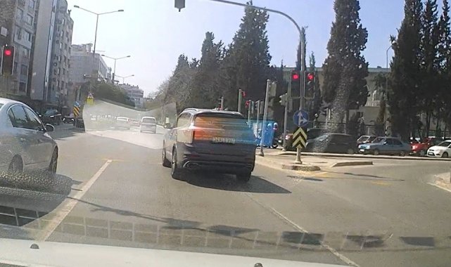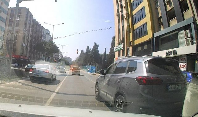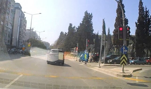 İzmir'in Konak ilçesinde trafikte seyreden bir otomobil, ani manevrayla başka bir aracı sıkıştırıp ardından kırmızı ışıkta geçerek tehlike saçtı. Muhtemel bir kazanın son anda atlatıldığı olayda kural tanımaz sürücünün o anları araç kamerasına yansıdı.