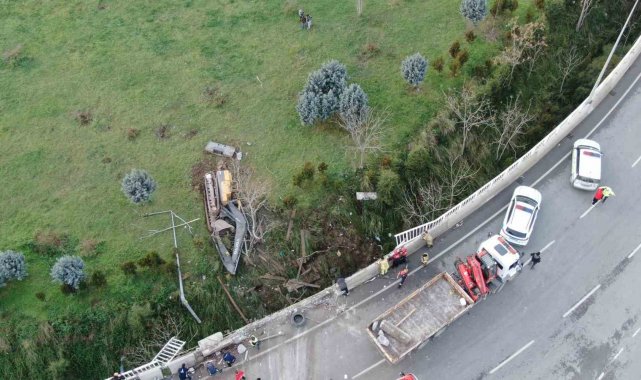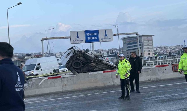 İzmir'in Buca ilçesinde, 'Uçan Yol' olarak bilinen Homeros Bulvarı'nda freni boşalan çekicinin viyadükten aşağı uçtuğu, bir otomobilin ise asılı kaldığı kazada 1'i ağır 3 kişi yaralandı.