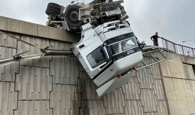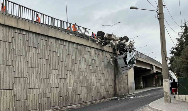 Öte yandan kaza anı ise bir güvenlik kamerasınca kaydedildi. Görüntülerde, viyadükte seyir halindeki tırın kontrolden çıkarak önce sola sonra sağa manevra yapıp viyadükten aşağıya sarkarak askıda kaldığı anlar yer aldı.