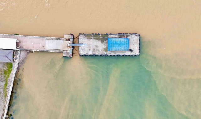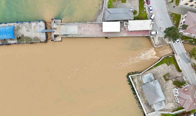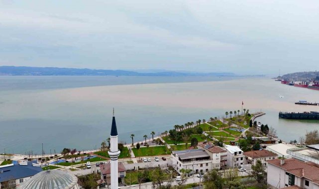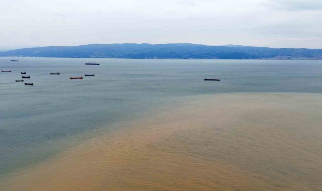 Kocaeli'nin Körfez ilçesinde etkili olan sağanağın ardından derelerden İzmit Körfezi'ne akan çamurlu sular, denizin bir bölümünün rengini kahverengiye dönüştürdü. O anlar havadan da görüntülendi.