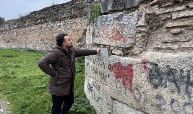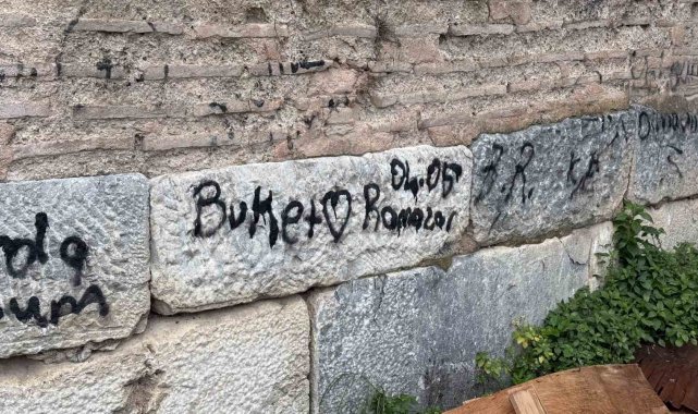 İznik'te 2 bin yıllık surlara sprey boya ile yazılan yazılar tepki çekti