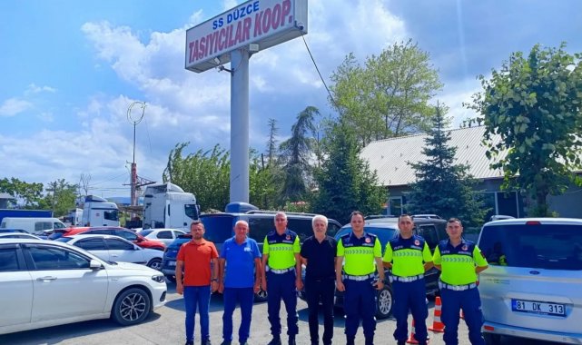 Düzce İl Jandarma Trafik Şube Komutanlığından Jandarma Teğmen İlker Yetiştiren, J. Astsb. Kd. Bçvş. Tansu Özdemir ve Uzm. J. Mustafa Yalçınkaya, Düzce Merkez Bölgesi Kamyon ve Tır Motorlu Taşıyıcılar Kooperatifini ziyaret ederek trafik kuralları ile Karayollarında uyulması gereken genel konular hakkında bilgiler verdiler.