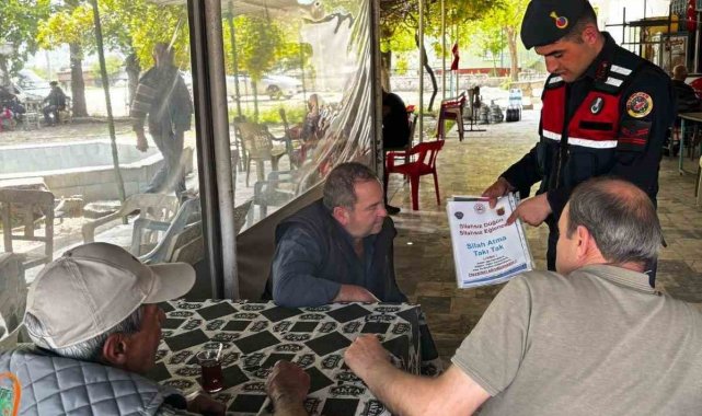 Aydın İl Jandarma Komutanlığı ekipleri düğün, nişan, asker eğlencesi, maç ve bayram kutlamaları gibi faaliyetlerdeki kontrollerine aralıksız devam ediyor. Kutlamalarda yasak olmasına rağmen kullanılan silahlarla havaya ateş açılması sonucu yaşanan kazaların önüne geçilmesi ve denetimlerin yapılması adına çalışmalarını sürdüren ekipler, gerçekleştirdikleri devriyelerde "Mutluluğa Kurşun Sıkma Geleceği Karartma" mottosuyla vatandaşları bilgilendiriyor. Ayrıca hazırlanan afiş ve görseller de vatandaşların kalabalık bulunduğu yerlere asılarak farkındalık oluşturuluyor. Bu kapsamda çalışmalarını sürdüren jandarma ekiplerinin son durağı Karpuzlu ilçesi oldu. Karpuzlu İlçe Jandarma Komutanlığınca Ömerler, Çobanisa ve Güney mahallelerindeki vatandaşlar bilgilendirildi.