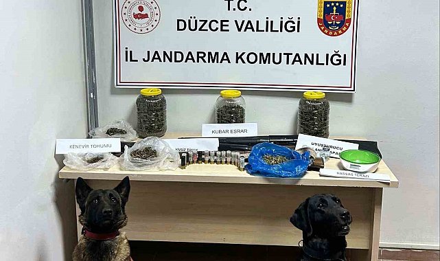 Düzce'de Cumhuriyet Başsavcılığı koordinesinde jandarma ekiplerinin uyuşturucu ile mücadelesi devam ediyor. Gümüşova ilçesi Pazarcık köyünde İlçe Jandarma Komutanlığı ve KOM Şube Müdürlüğü tarafından yapılan araştırma sonucunda bir şahsın uyuşturucu ve uyarıcı madde ticareti yaptığına dair alınan duyumlar çerçevesinde şüpheli şahsın ikametlerinde arama yapıldı. Yapılan aramada 3 kavanoz ve ayrı ayrı poşetler içerisinde toplam bin 335 gram kubar esrar maddesi, 1 adet ruhsatsız tek kırma tüfek, 2 adet ruhsatsız otomatik tüfek, çalışır vaziyette hassas terazi, 6 gram kenevir tohumu, uyuşturucu madde kullanma aparatı ve 16 adet av tüfeğine ait kartuş ele geçirildi. Olayla ilgili uyuşturucu madde ticareti yapma suçundan işlem yapılan 1 şüphelinin gözaltına alındığı bildirildi.