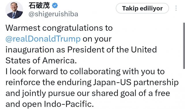 ABD Başkanı Donald Trump'ın yemin ederek resmi olarak göreve başlamasının ardından Japonya ve Güney Kore liderlerinden Trump'a tebrik mesajları geldi. Japonya Başbakanı Shigeru Ishiba sosyal medya platformu X üzerinden yaptığı paylaşımda Trump'a içten tebriklerini ilettiğini belirterek, "Ebedi Japonya-ABD ortaklığını güçlendirmek ve ortak hedefimiz olan özgür ve açık Hint-Pasifik vizyonunu birlikte sürdürmek için sizinle işbirliği yapmayı dört gözle bekliyorum" ifadelerini kullandı.