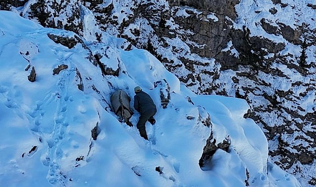 Erzincan'ın Kemah ilçesi kırsalında, karla kaplı arazide avlanması yasak ve koruma altındaki tür olan dağ keçisini avlayan avcı, drona yakalandı. Kaçak avcı kendini kamufle etmek için dağ keçisinin yanına uzanarak bir süre hareketsiz bekledi.
