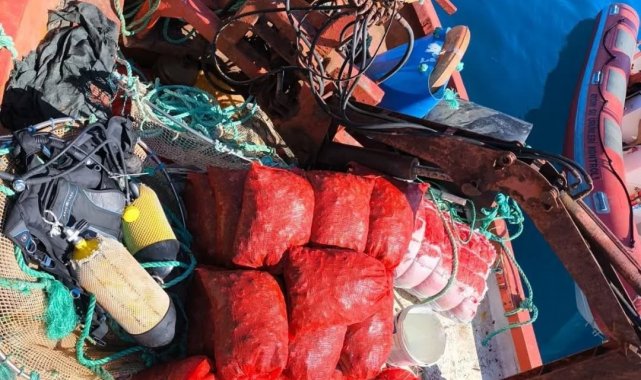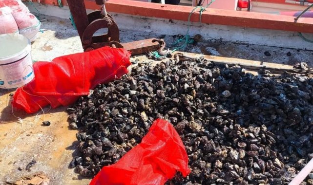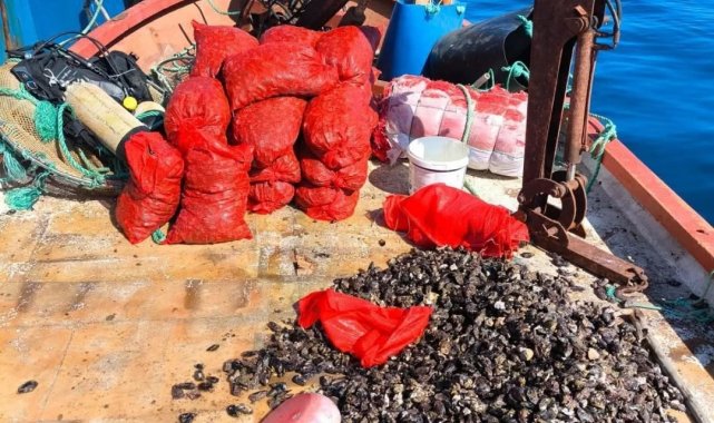 Aydın'da ruhsatı olmayan gemi ile avlanan 600 kilogram midye tekrar denize bırakıldı.