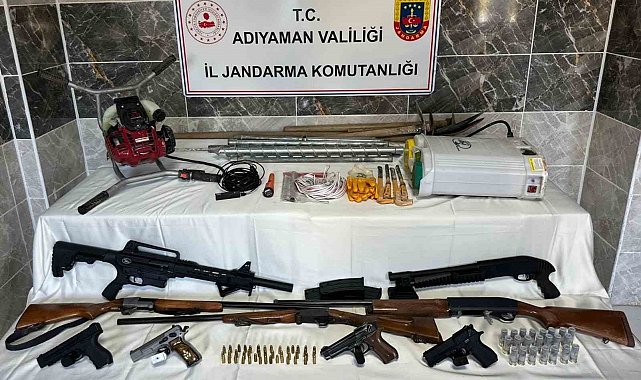 22 adet av tüfeği fişeği, 4 adet ruhsatsız tabanca ve şarjörü, 2 adet kurusıkı tabanca ve şarjörü, 42 adet 9mm çapında tabanca fişeği ,1 adet kaya delme makinası, 1 adet yer altı görüntü cihazı, 2 adet el dedektörü, 200 gram kaya kırıcı olarak tabir edilen el yapımı patlayıcı madde ele geçirildi.