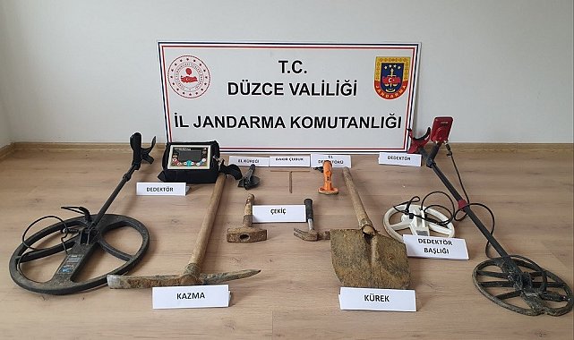 Düzce İl Jandarma Komutanlığı'na bağlı Cumayeri İlçe Jandarma Komutanlığı ekipleri devriye sırasında ormanlık alanda hareketlilik olduğunu fark etti. Alanda yapılan incelemede kaçak kazı yapan 3 kişi ile birlikte 3 adet dedektör, 2 adet kürek, 1 adet kazma, 2 adet bakır çubuk, 2 adet çekiç, 3 adet şarj aleti ele geçirildi.