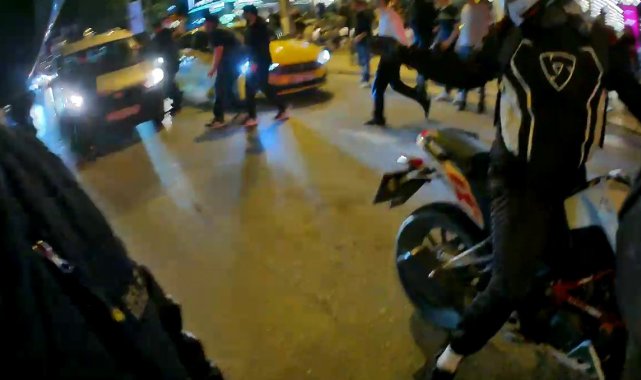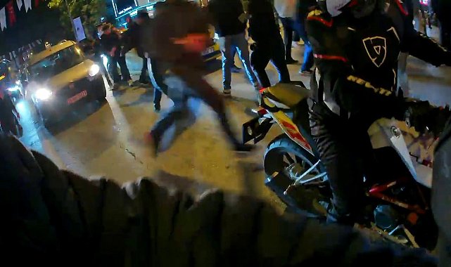 Kadıköy'de kalabalık bir grup, Galatasaray atkısı bulunan bir araca tekme ve yumruklarla saldırdı. O anlar bir motosikletlinin kask kamerasına yansıdı.