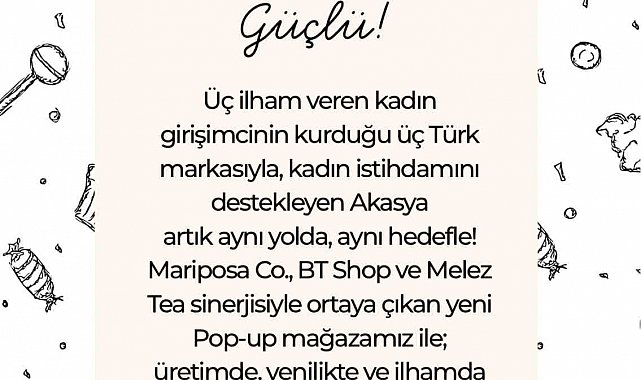 Akasya, kadın girişimciler Ece Sarıoğlu, Buse Terim ve Liliana Aslanoba'nın markaları Mariposa Co., BT Shop ve Melez Tea'nin buluştuğu yenilikçi bir iş birliğine imza atıyor. 23 Mayıs'ta açılacak olan pop-up mağaza, anneler ve çocuklara özel seçkin ürünler ile ilham dolu etkinlikler sunuyor.