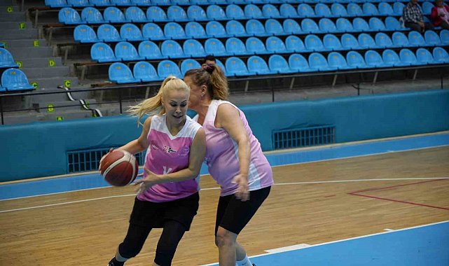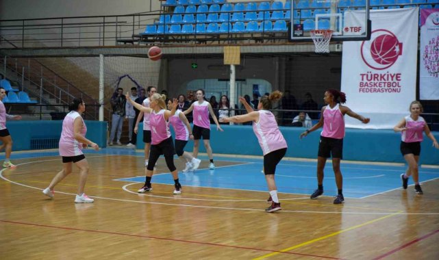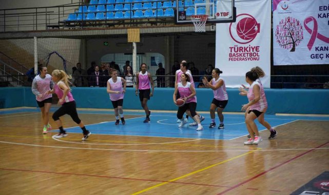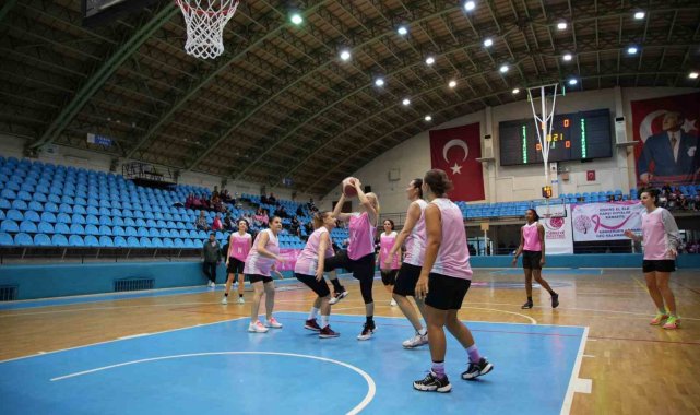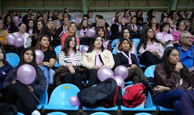 Spor salonu pembe balonlarla süslenirken, tribünleri dolduran kadınlar da pembe fular ve kurdeleleriyle farkındalık mesajına destek verdi. Dostluk havasında geçen karşılaşma, 40-31'lik skorla sona erdi.