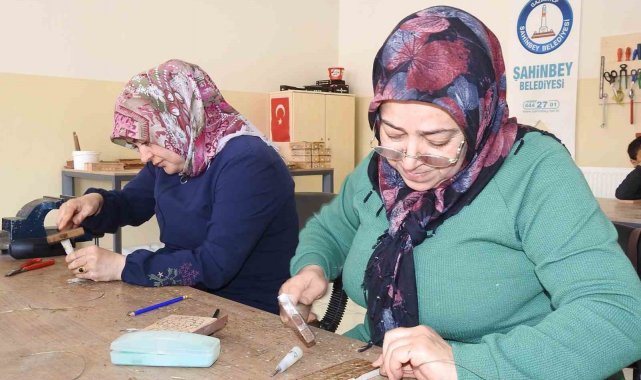 Şahinbey Belediyesi'ne bağlı Hasan Celal Güzel Gençlik Merkezi'nde sedef kakma kursuna katılan kadınlar, hünerli elleriyle birbirinden güzel ahşap işlemeler yapıyor.