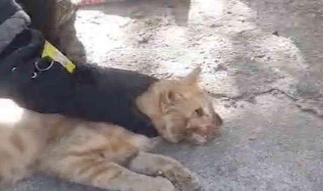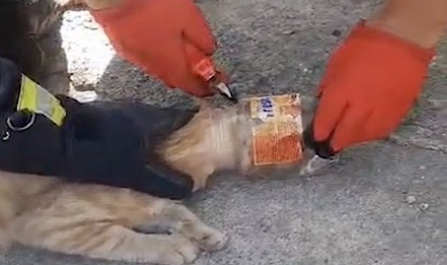 Kafası plastik kavanoza sıkışan kediyi itfaiye kurtardı